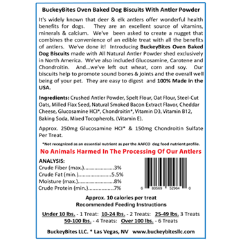 It's widely known that deer and elk antlers offer wonderful health benefits for dogs. They are an excellent source of vitamins, minerals, and calcium. BuckeyBites has created the world’s first tasty dog biscuit that combines the convenience of an edible treat with all the benefits of antlers. BuckeyBites Oven Baked Dog Biscuits made with All Natural Antler Powder provide all the benefits of antlers in a daily, tasty treat. We've also included Glucosamine, Carotene and Chondroitin in the mix to super charge their effectiveness. These biscuits help to promote sound bones and joints, and the overall well-being of your pet. They contain no wheat, no soy, and no corn. They are easy to digest and 100% made in the USA.